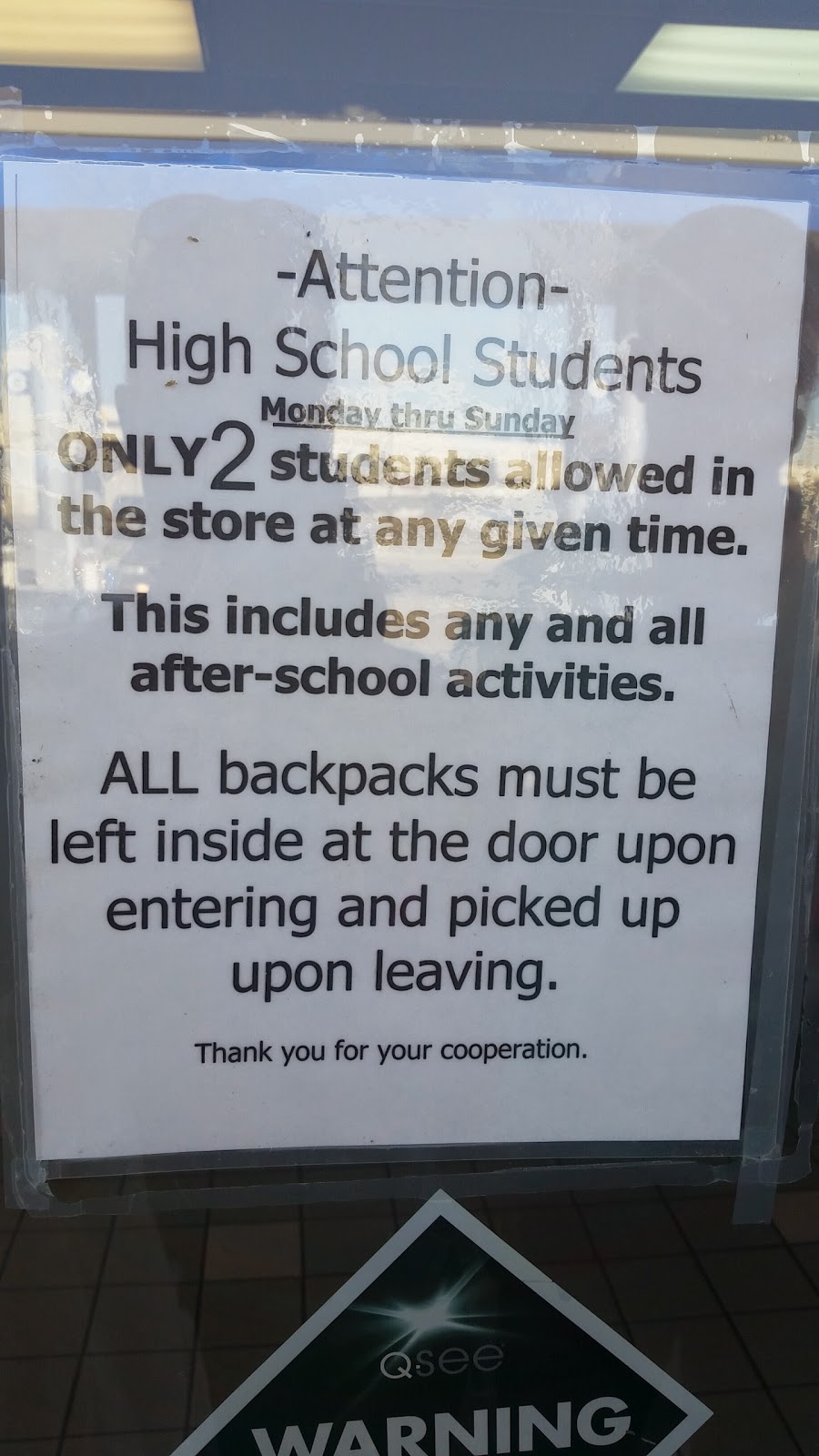 Everything made sense afterwards. First it says Monday through Sunday, meaning everyday. I know there are some places that get hit hard by kids stealing but I’ve never seen a sign like this. Interestingly, Pace has signs like this in the cafeteria about kids stealing food. I thought I saw a couple people do it but now there are signs and the ladies doing the check out now look at your receipt properly when leaving if you don’t check out with them.